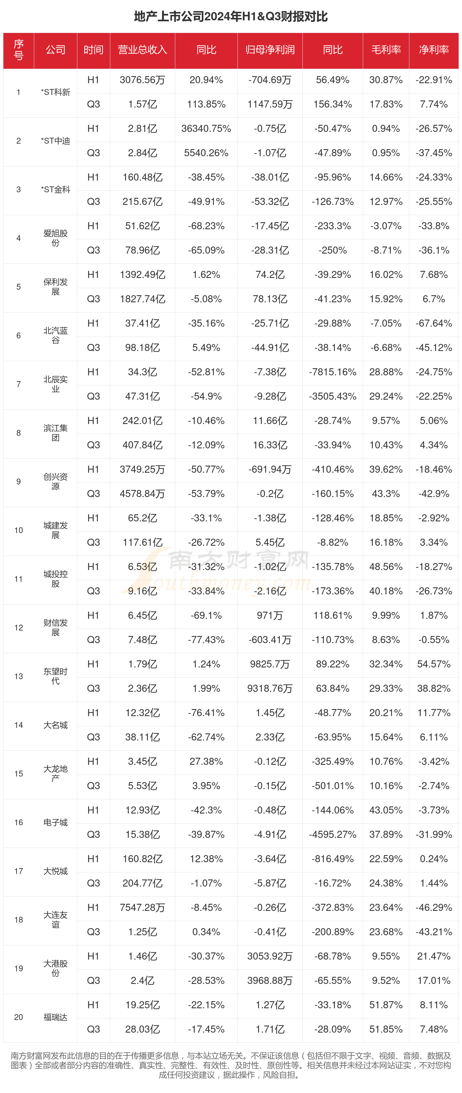 2025-03-04根据南方财富网概念查询工具数据统计,A股136家地产相关上市公司已发布2024年前三季度财报。2024年前三季度大家都过得怎么样?一起来看看吧。 上实发展(600748):2024年第三季度,公司营业总收入同比增长-64.99%至5.71亿元;净利润为-1.02亿,同比增长-932.32%,毛利润为1.12亿,毛...