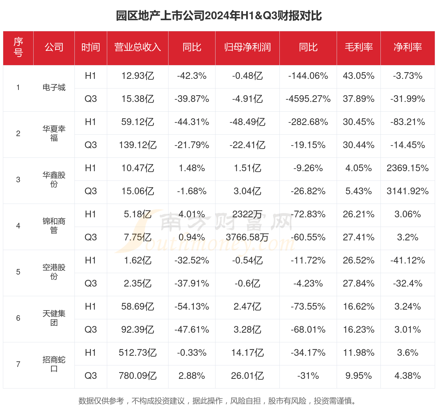 2025-03-02根据南方财富网概念查询工具数据统计,A股7家园区地产相关上市公司已发布2024年前三季度财报。2024年前三季度大家都过得怎么样?一起来看看吧。 华夏幸福(600340):华夏幸福公司2024年第三季度营收同比增长11.56%至80亿元;华夏幸福净利润为26.09亿,同比增长525.29%,毛利润为24.35亿,...
