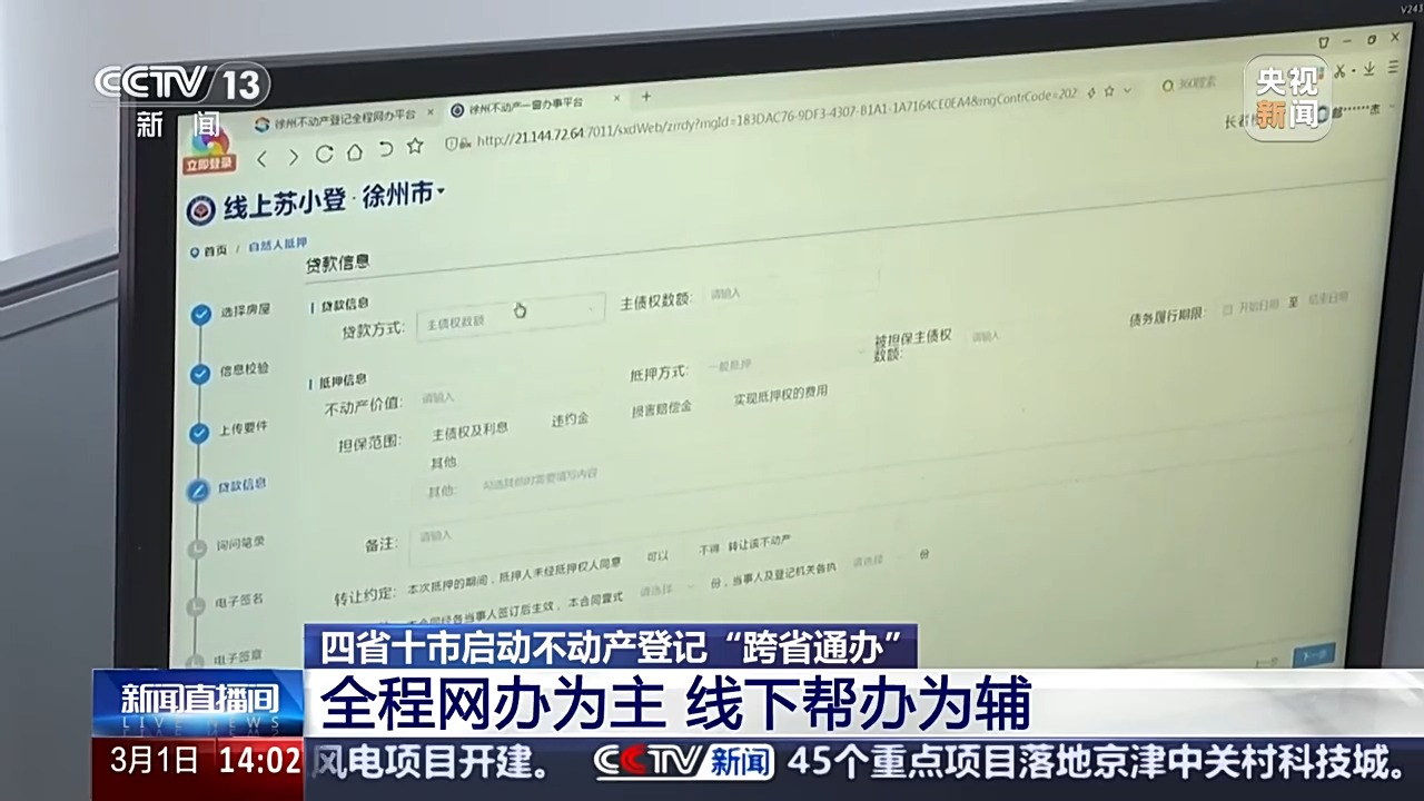2025-03-01江苏、安徽、山东、河南4省的10个城市正式签订合作框架协议,宣布启动不动产登记“跨省通办” 此次四省十市启动不动产登记“跨省通办”,那究竟什么业务可以跨省来办呢?具体又该如何操作? 在江苏徐州登记中心的服务窗口,工作人员正通过网络审核一位身在安徽淮北的申请人所提交的登记申请材料。现在,4个省10个城市通过集成各...