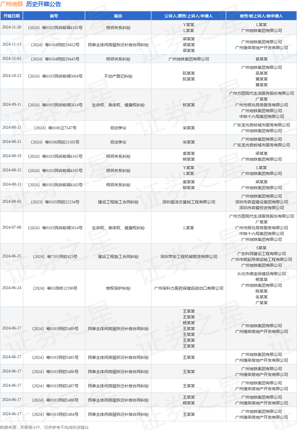 2024-09-30证券之星消息,根据天眼查APP显示,近日公布了一则广州地铁集团有限公司作为被告/被上诉人的开庭公告,详细内容如下: 根据统计,近一年内以广州地铁集团有限公司为当事人的历史开庭公告有86则,其中案由为“民事主体间房屋拆迁补偿合同纠纷”的公告以21则居首,其次为“房屋拆迁安置补偿合同纠纷”有6则,“合同纠纷”有6则。...